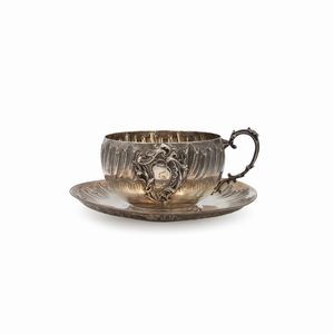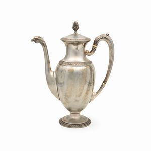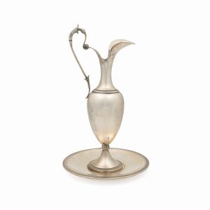 38x23 cm. Italia, XX Sec. orafo Cesa Alessandria, corpo liscio con profili decorati con motivi Impero, manico [..]