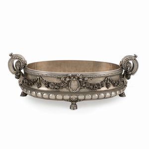 21x59x34 cm. Austria, XIX Sec. orafo Frank Brüder, corpo ovale baccellato e cesellato con ghirlande floreali [..]