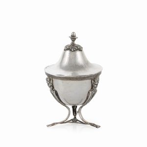 h. massima 23 cm. Germania, XIX Sec. corpo piriforme poggiante su tre sostegni cesellati con motivi Impero e [..]