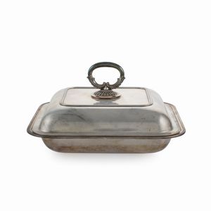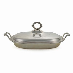 15x42,5x26,5 cm. Italia, XX Sec. corpo liscio, manici e presa del coperchio cesellati con motivi di volute vegetali, [..]