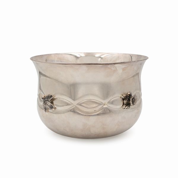 Italia, XX Sec. orafo Cesa, Alessandria, corpo liscio di forma circolare sbalzato al centro con motivi elicoidali, decorato con elementi vegetali e floreali, peso 605 gr.