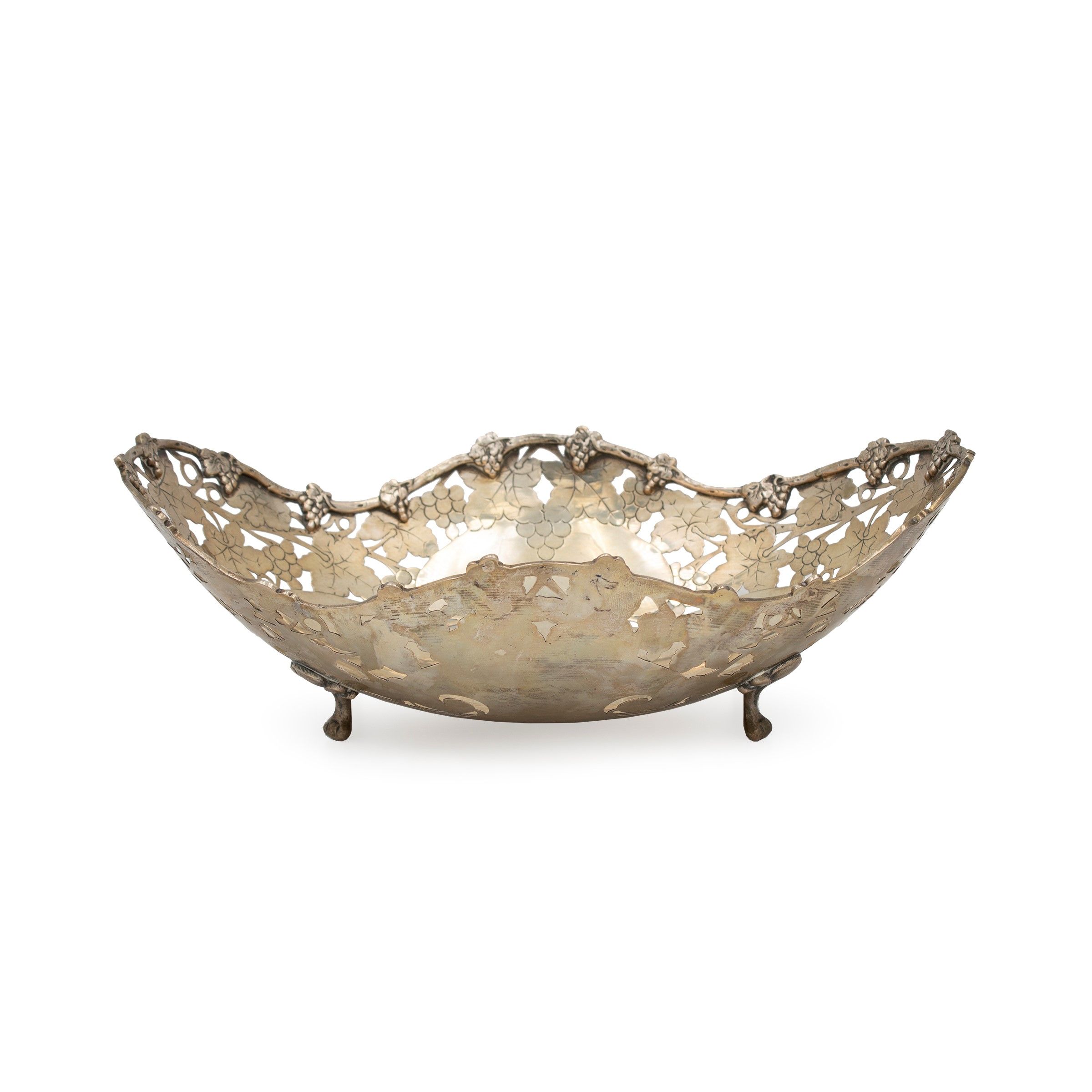 Italia, bollo Fascio orafi Castaudi & Gautero, Vercelli; corpo di linea mossa, traforato e cesellato con grappoli d'uva e foglie di vite, poggiante su quattro piedini, peso 317 gr.