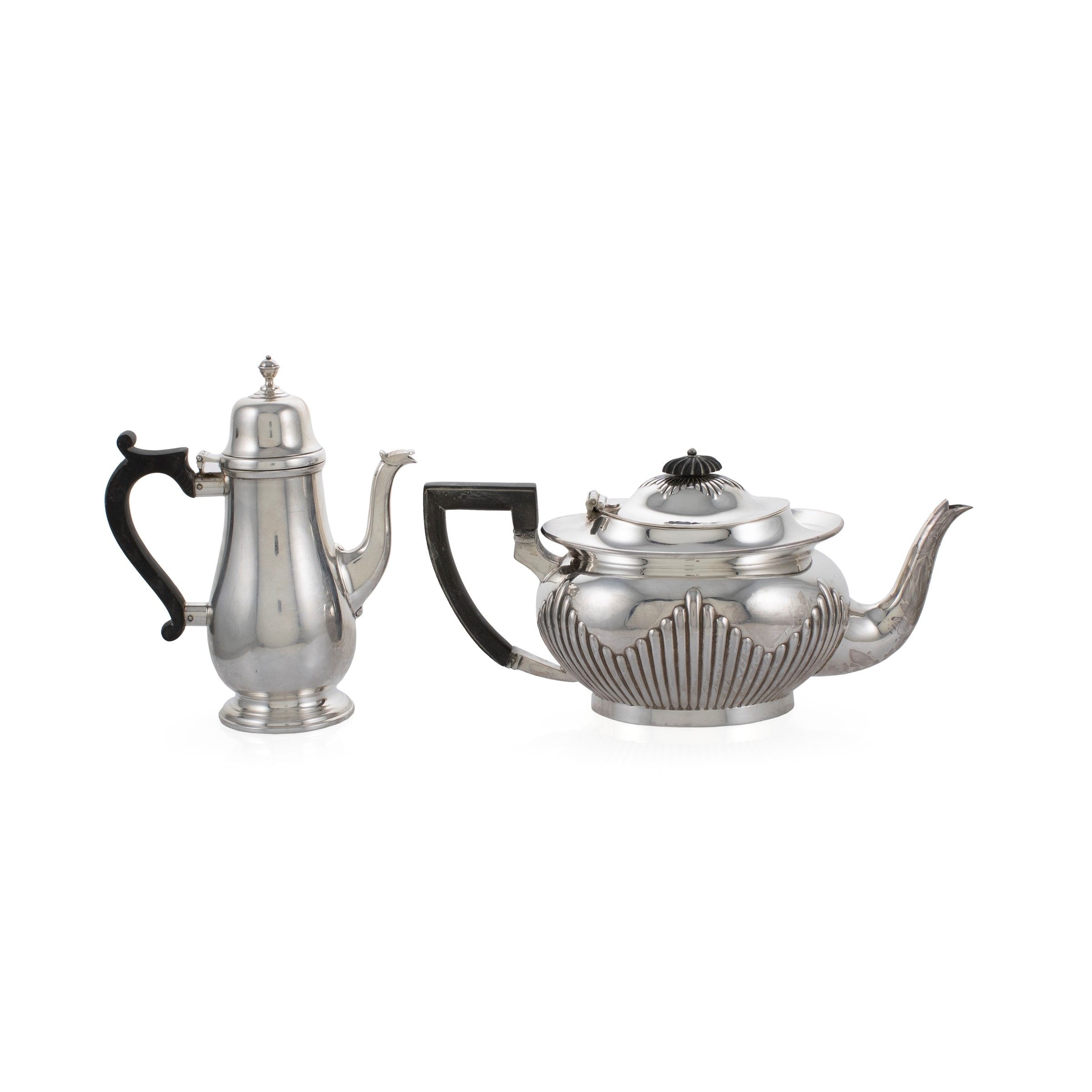 Inghilterra, XX Sec. manifattura Mappin & Webb, composto da: una teiera in metallo argentato, corpo baccellato, manico e presa del coperchio in bachelite, 14x29x13 cm. una caffettiera egoiste in metallo argentato, corpo liscio di forma piriforme, manico in bachelite, h. 19 cm.