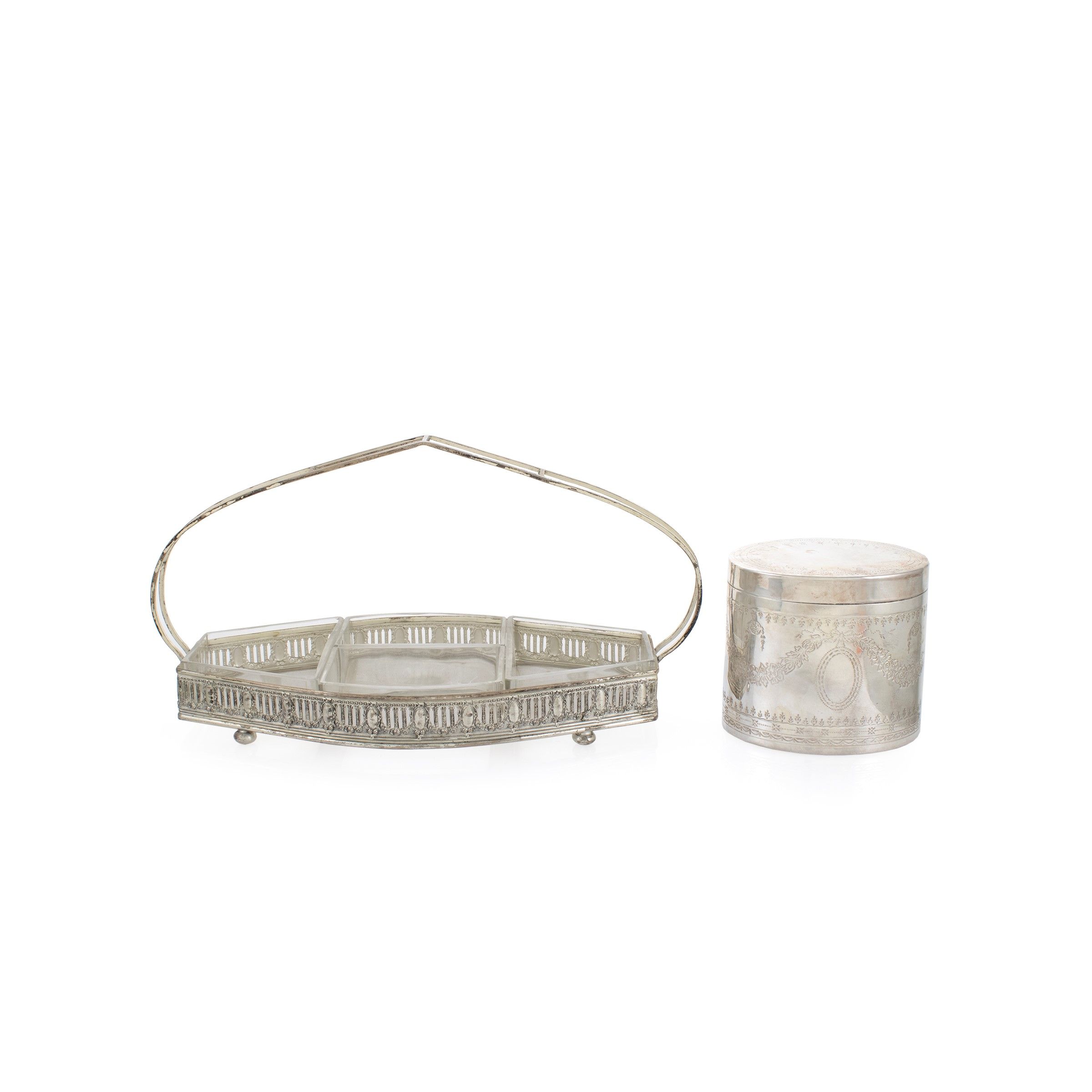Gruppo di oggetti in metallo argentato