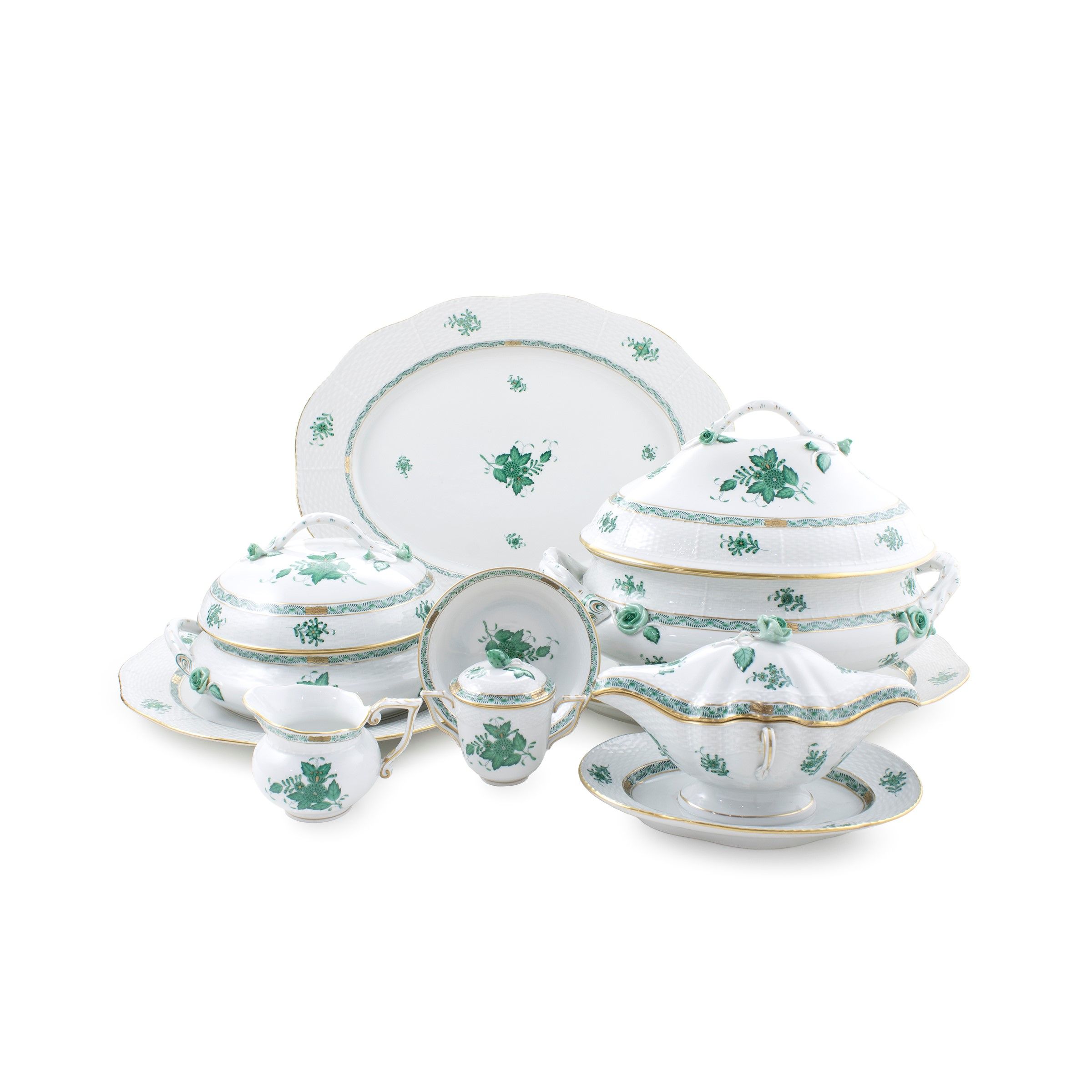 Ungheria, XX Sec. decoro Apponyi verde in porcellana monocroma su fondo bianco e profilo dorato, marchio della produzione, lievi difetti. Composto da: una zuppiera 28x37x25 cm. una legumiera 16x29x25 cm. una insalatiera 9,5x25x25 cm. 4 piatti ovali da portata misura massima 47x35 cm. un piatto circolare da portata d. 35 cm. una salsiera 17x24,5x17,5 cm. una lattiera h. 9 cm. 10 tazze da brodo con coperchio h. 10,5 cm. con 10 piattini d. 14 cm.