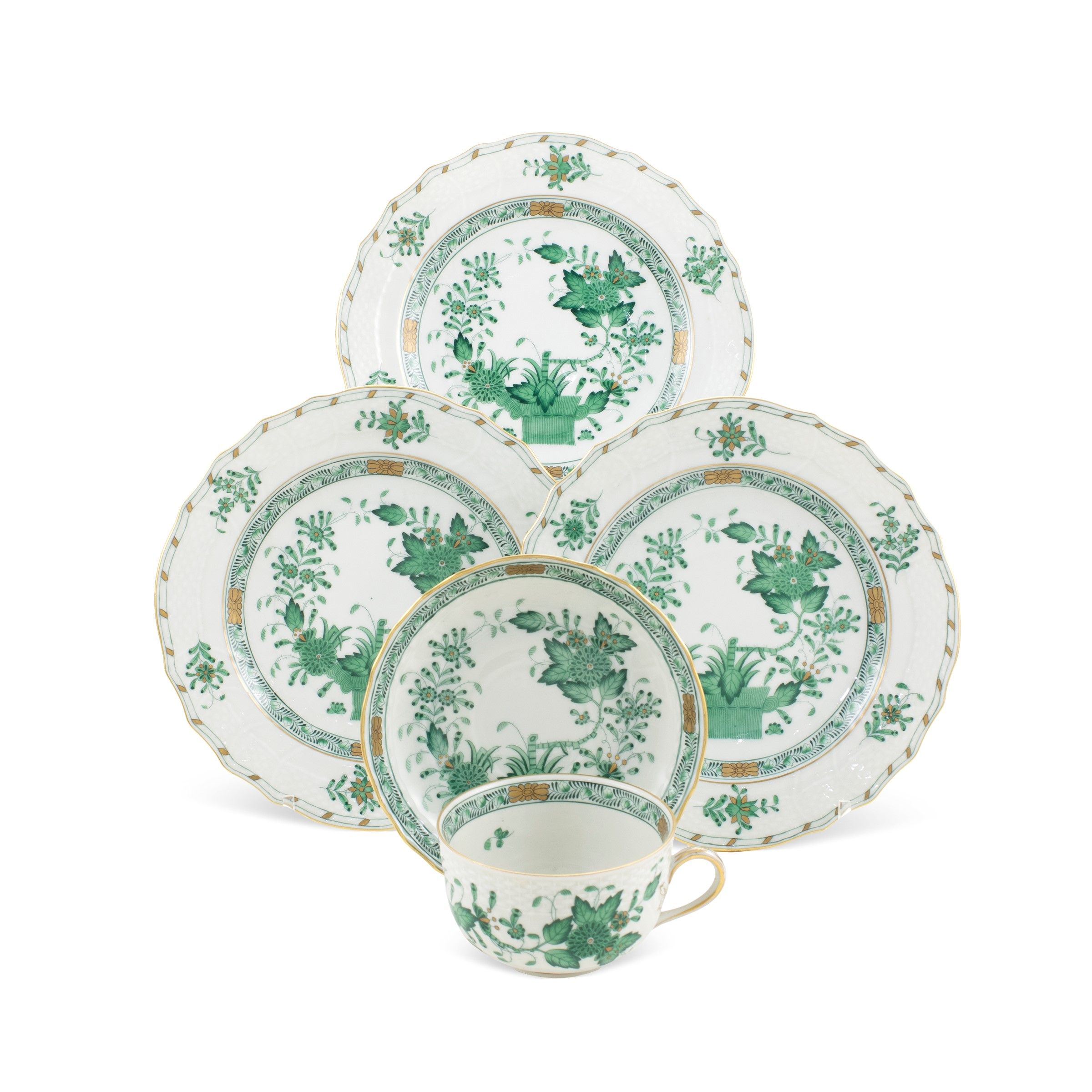Ungheria, XX Sec. decoro Indian basket verde, in porcellana monocroma su fondo bianco e profilo dorato, marchio della produzione. Composto da: 10 tazze da the h. 5,5 cm. con 10 piattini d. 13.5 cm. 10 piatti da dolce d. 19 cm.