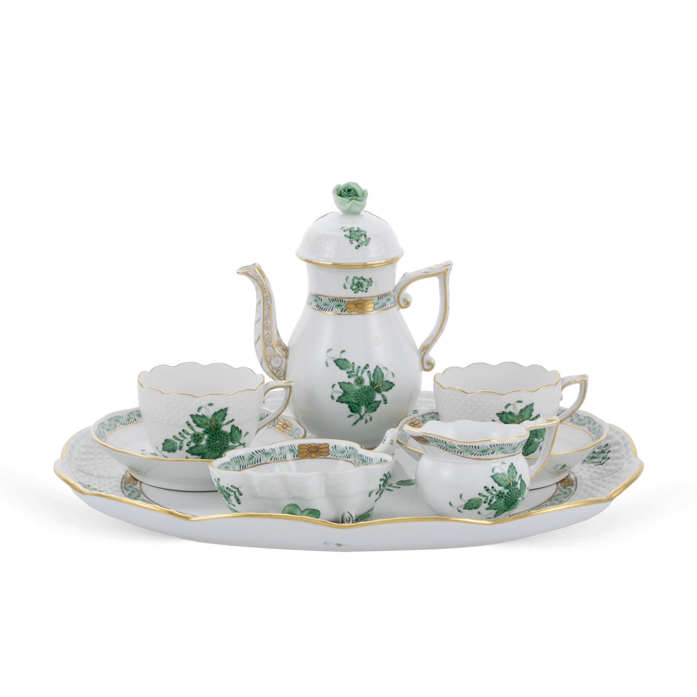vassoio 31,5x25 cm. Ungheria, XX sec. decoro Appony verde in porcellana monocroma su fondo bianco, bordo Ozier con profilo dorato, marchio della produzione. Composto da: un vassoio ovale 31 cm. 2 tazzine da caffè h. 5 cm con 2 piattini d. 11,5 cm. una caffettiera h. 15 cm. una lattiera h. 5 cm. una zuccheriera a foglia 3,5x10x8 cm.