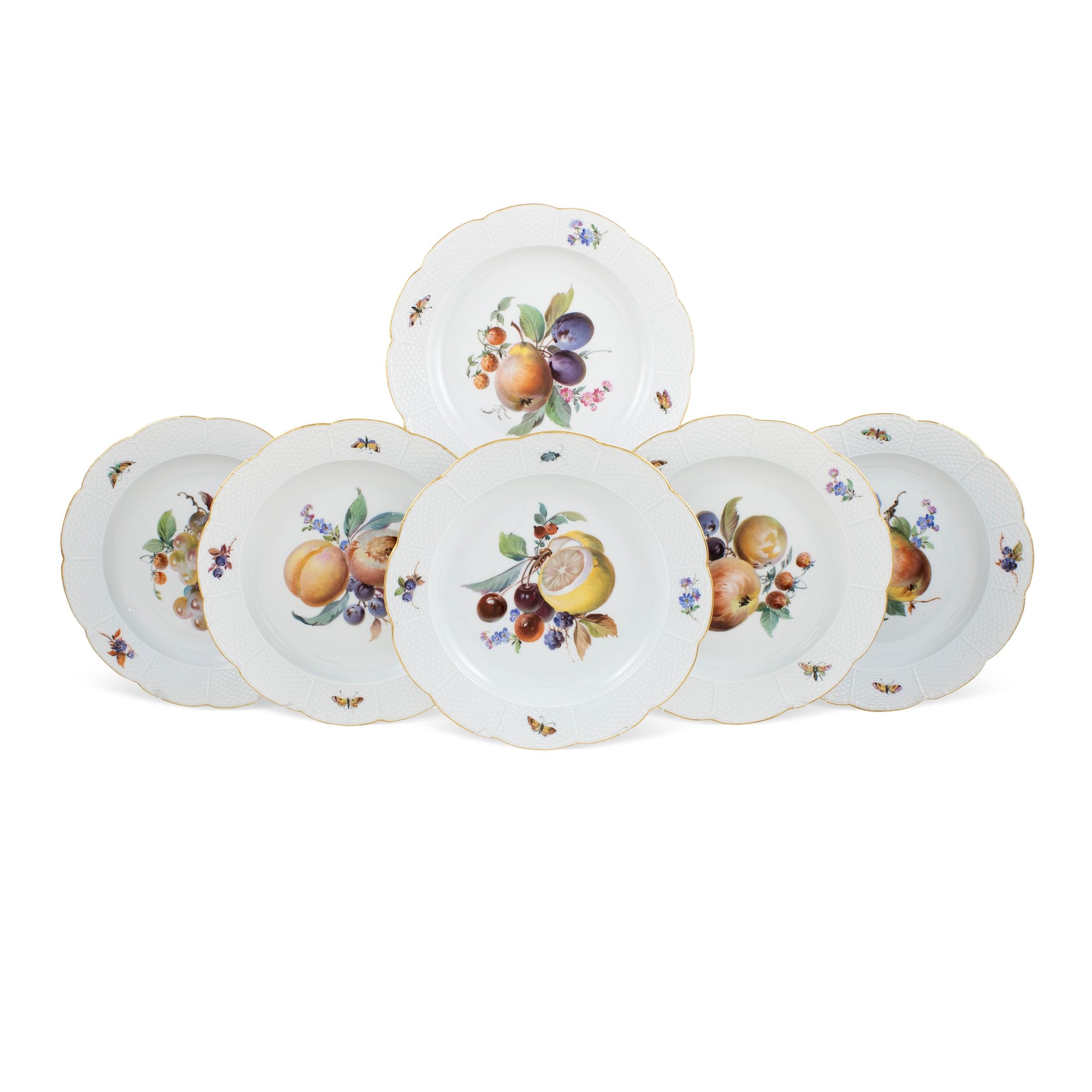 Germania, XIX-XX Sec. in porcellana bianca decorata in policromia con motivi di frutta e farfalle, profilo dorato, marchio della produzione