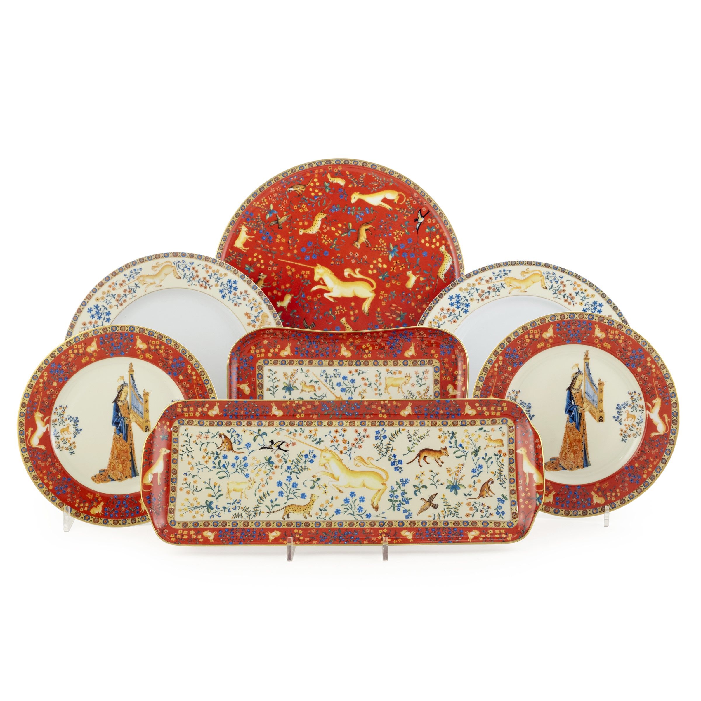 piatto d. 30 cm. Francia, XX Sec. decoro La Dame a Licorne, in porcellana policroma, marchio della produzione Composto da: 16 piatti piani d. 26,5 cm. 20 piatti da frutta d. 21,5 cm. 2 piatti circolari da portata d. 30 cm. 2 piatti rettangolari da portata 40X15 cm. 2 raviere 26x19,5 cm.
