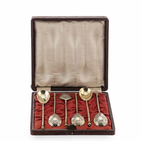 Russia, 1888 orafo V. M. Ashmarin, decorati con motivi naturalistici e manico tornito, entro custodia, peso 110 gr.