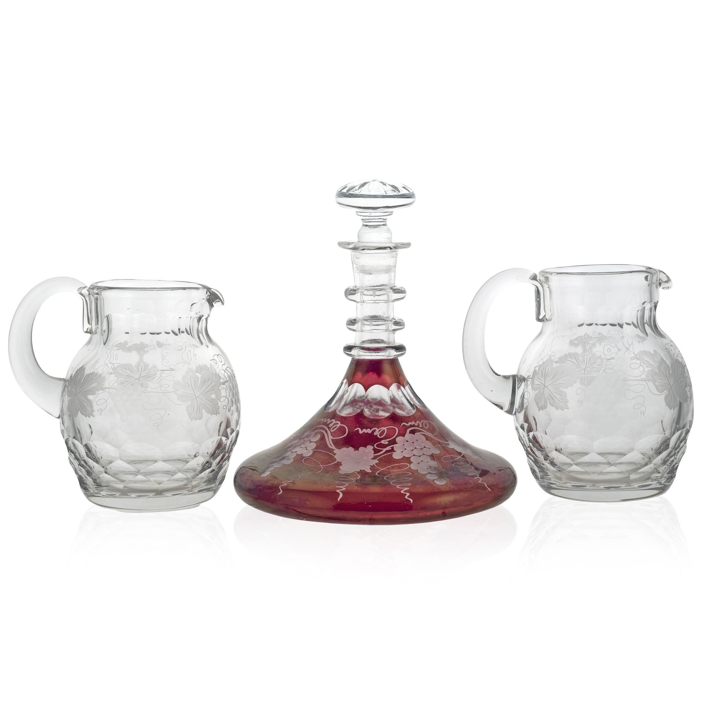 Belgio, XX Sec. in cristallo trasparente, satinato e colorato decorato con motivi a grappoli di uva e foglie di vite, composto da: