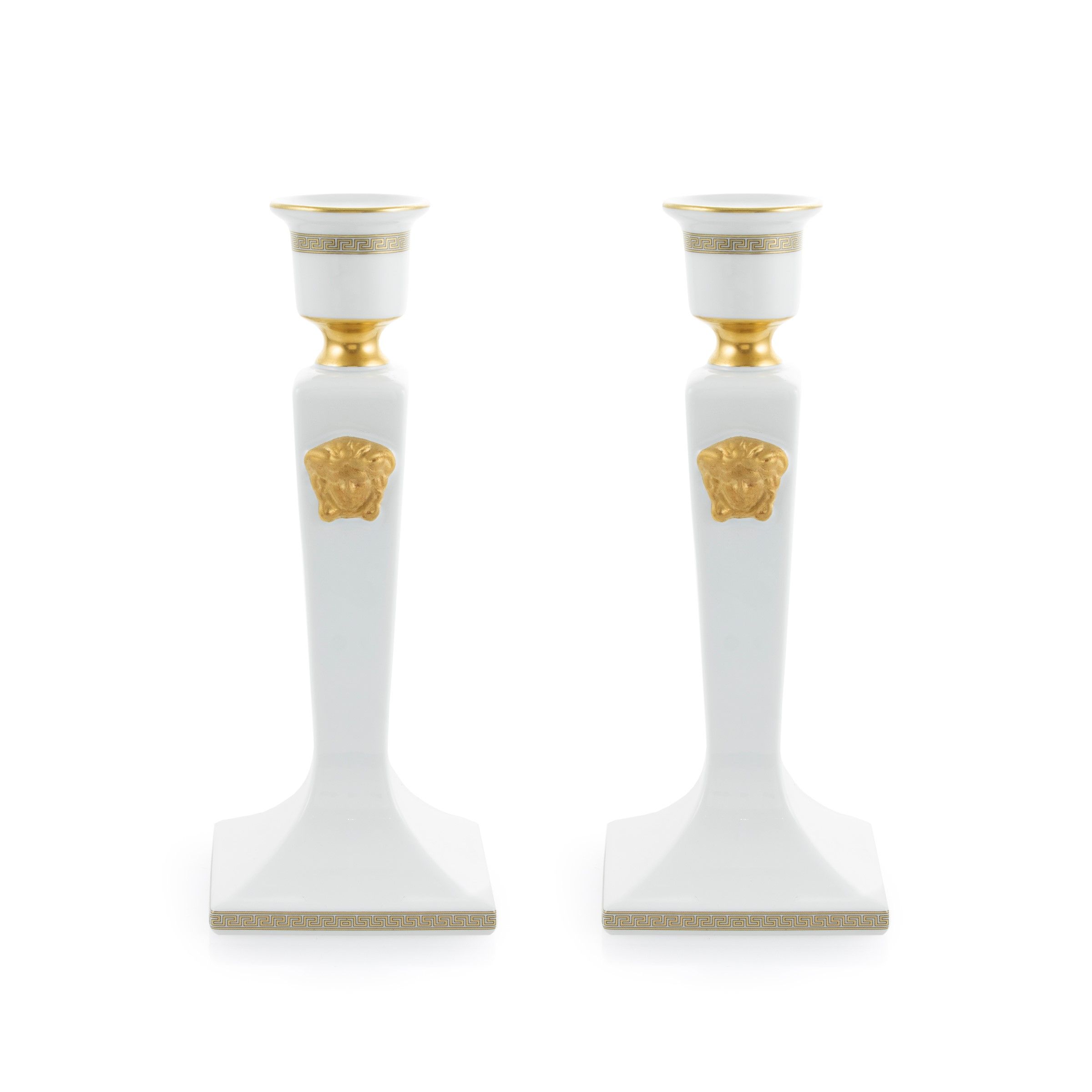 Germania, XX Sec. coppia di candelieri collezione Gorgona in porcellana bianca e dorata, marchio della produzione