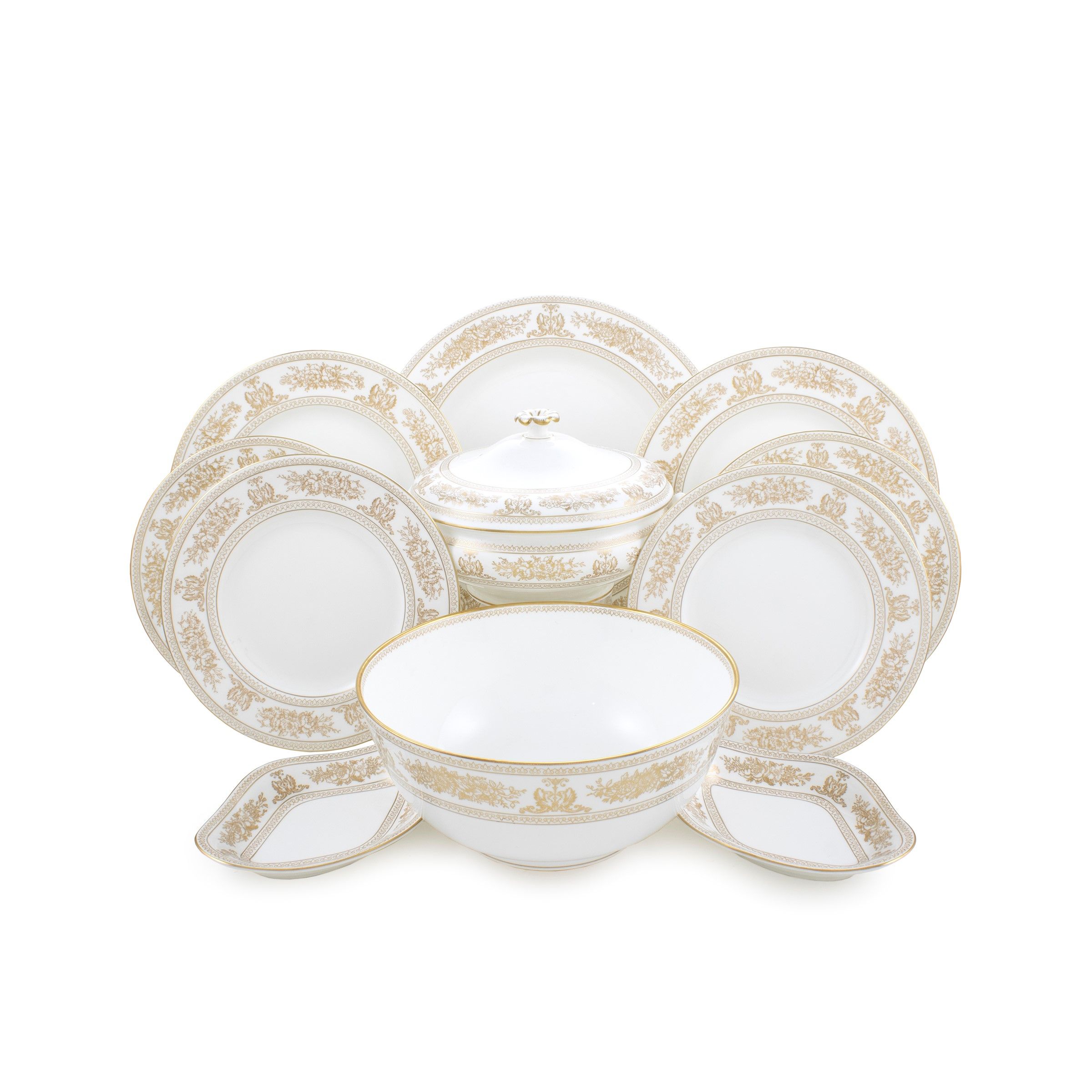 Inghilterra, XX Sec. decoro Gold Columbia in ceramica avorio con decoro dorato, marchio della produzione. Composto da: 19 piatti piani d. 27,5 cm. 9 piatti fondi d. 23 cm. 22 piatti da frutta d. 22,5 cm. una zuppiera 15x23 cm. una insalatiera 11x24,5 cm. un piatto da portata circolare d. 33,5 cm. 3 raviere 19,5x14,5 cm.