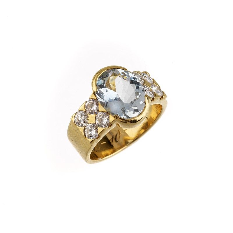 ANELLO A FASCIA CON ACQUAMARINA E DIAMANTI in oro giallo 18kt, con al centro un'acquamarina taglio ovale di ct 1.70 circa, affiancata da diamanti taglio brillante per ct 0.80 circa, punzoni 750 e del fabbricante, mis. 9/49, gr. 6