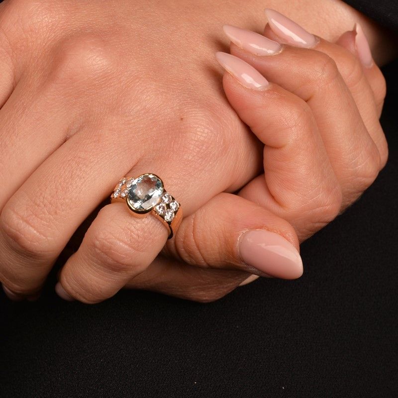 AQUAMARINE AND DIAMOND BAND RING IN 18KT YELLOW GOLD