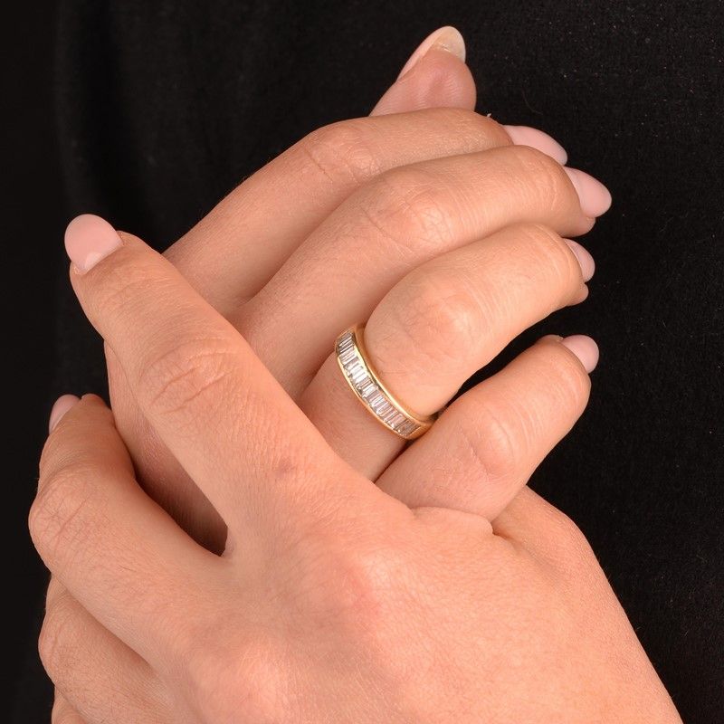in oro giallo 18kt, impreziosito da una serie di diamanti taglio baguette per ct 1 circa, punzone 750, mis. 12/52, gr. 5