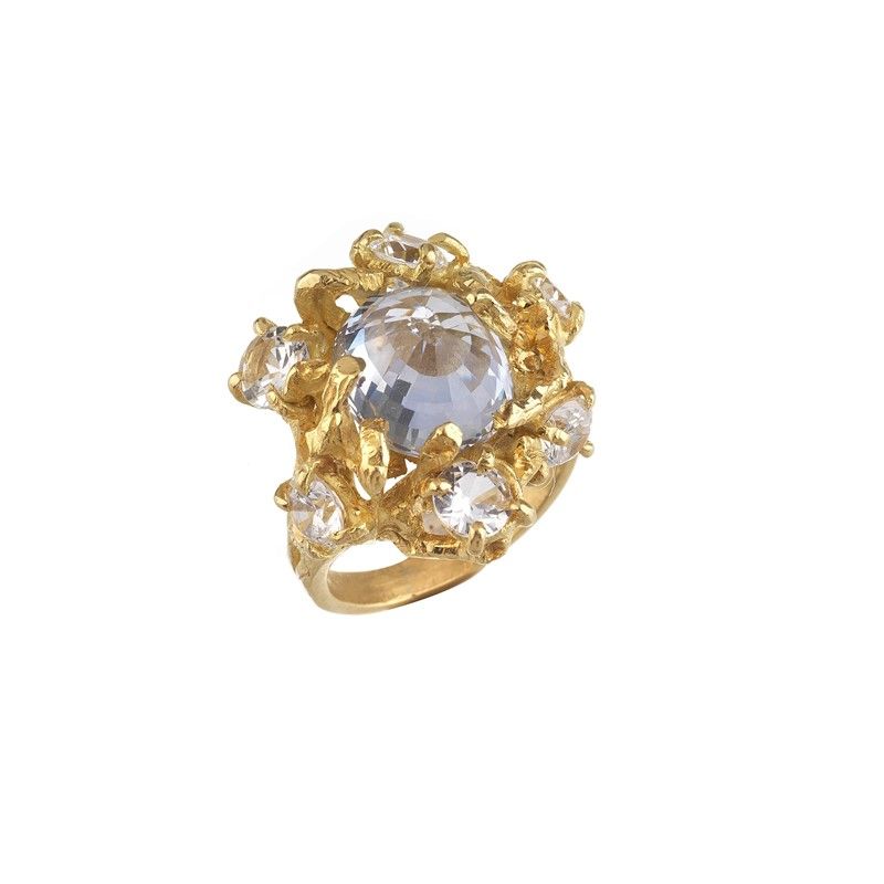 in oro giallo 18kt, con al centro una pietra sintetica blu sfaccettata cinta da sei pietre sintetiche incolore, punzone 750, mis. 13/53, gr. 12