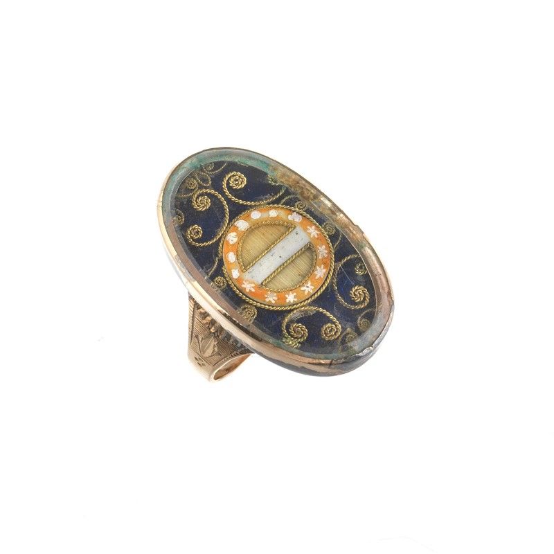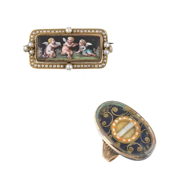 ANELLO E SPILLA CON SCENA FIGURATA spilla in oro a basso titolo e metallo, al centro una scena figurata realizzata in smalti policromi con raffigurati tre putti musicisti, incorniciata da una fila di microperle, dim. cm 4x2 circa, accompagnata da un anello in oro a basso titolo, decorato in smalti policromi (difetti), mis. 16/56, gr. 19 complessivi