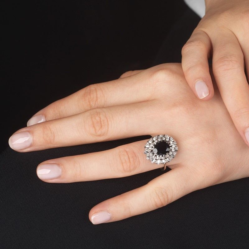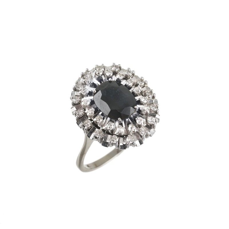 ANELLO FLOREALE CON ZAFFIRO E DIAMANTI in oro bianco 18kt, al centro uno zaffiro taglio ovale di ct 1.70 circa, circondato da una doppia fila di diamanti taglio huit huit per ct 0.30 circa, punzoni 750 e del fabbricante, mis. 18/58, gr. 6