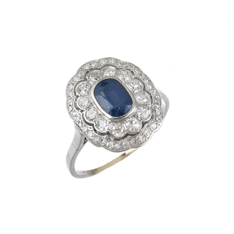 in platino, impreziosito al centro da uno zaffiro taglio ovale di ct 1 circa, circondato da diamanti taglio huit huit per ct 0.80 circa, mis. 21/61, gr. 5