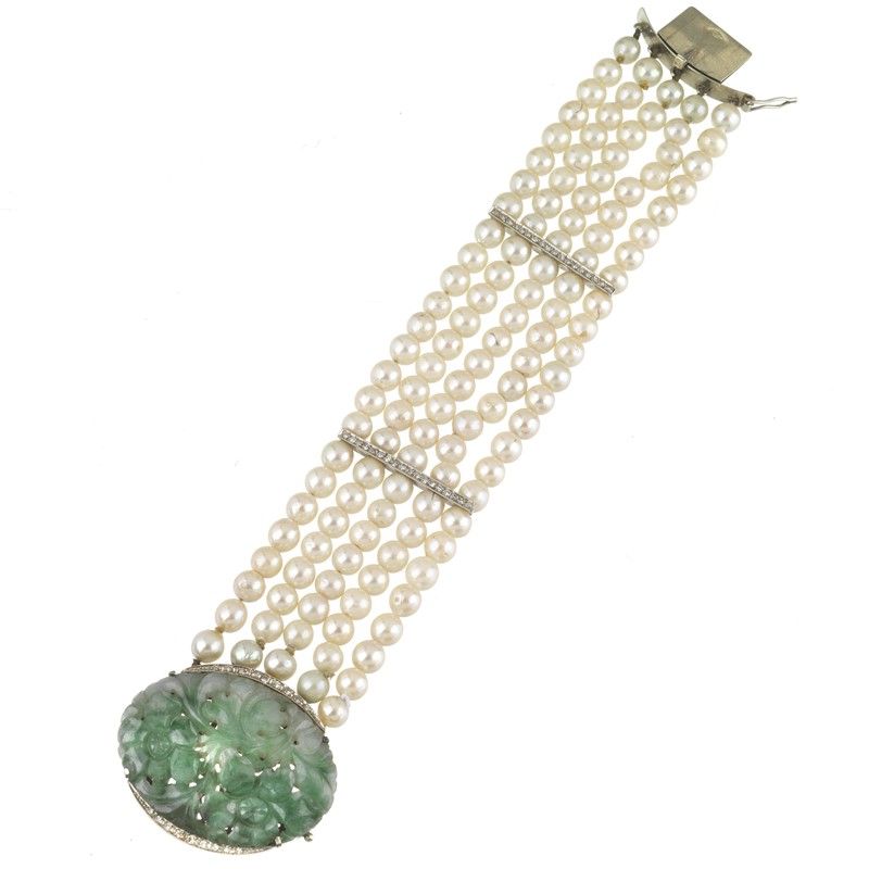 BRACCIALE A FASCIA CON PERLE GIADA E DIAMANTI composto da cinque fili di perle di mm 5 circa uniti a segmenti impreziositi da rose di diamante, fermatura e distanziali in oro bianco 18kt, giada traforata con motivi floreali incisi e diamanti taglio huit huit, punzone 750, lungh. cm 17,5, gr. 53