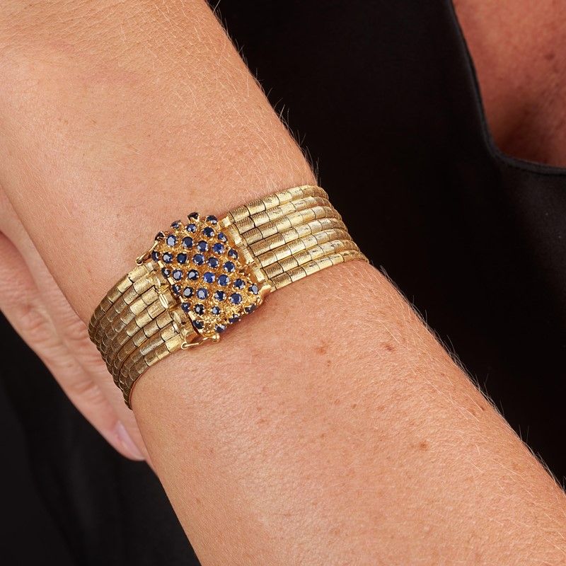 BRACCIALE A FASCIA CON ZAFFIRI in oro giallo 18kt, realizzato a maglia morbida, con sette fili di maglie rettangolari in oro satinato, chiusura impreziosita da zaffiri taglio rotondo (uno mancante) per ct 1.20 circa, punzoni 750 e del fabbricante, lungh. cm 19, gr. 51
