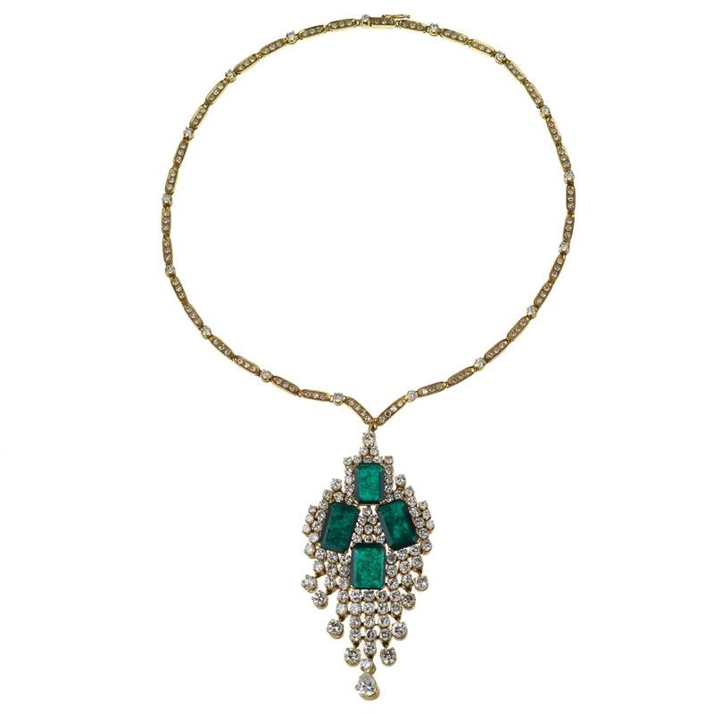 COLLANA CON SMERALDI SINTETICI E DIAMANTI in oro giallo 18kt, impreziosita da diamanti taglio brillante e huit huit per ct 5 circa, da cui pende un grande ciondolo impreziosito da quattro smeraldi sintetici taglio ottagonale e file di diamanti taglio brillante per ct 12 circa e un diamante taglio a goccia di ct 1.40 circa, punzone 750, lungh. cm 41, dim. pendente cm 4x8,5, gr. 72