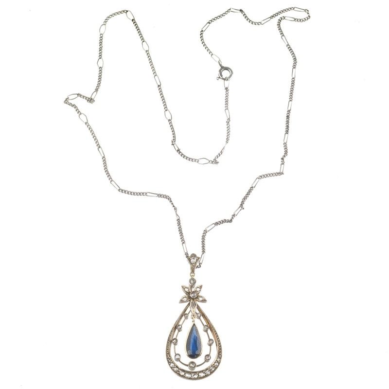 composta da catena in metallo e pendente in oro bianco 18kt, impreziosita da uno zaffiro taglio a goccia di ct 1.10 circa e rose di diamante, lungh. cm 48, gr. 8