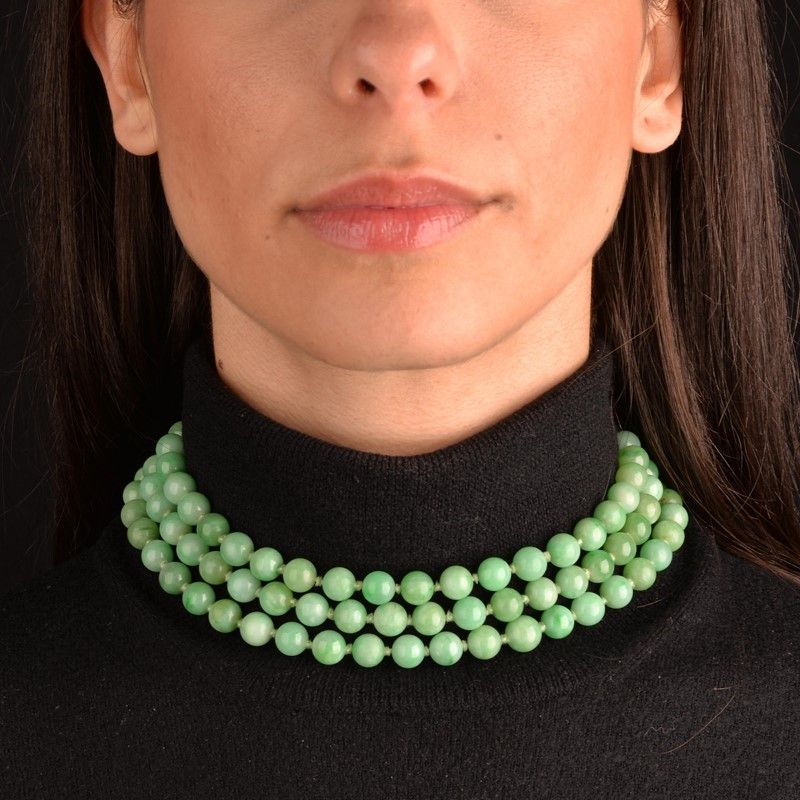 composta da tre fili di sfere in giada di mm 9 circa, fermatura in oro bianco 18kt impreziosita da diamanti taglio huit huit per ct 0.80 circa, lungh. cm 39, gr. 156