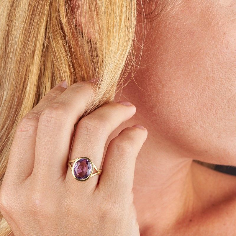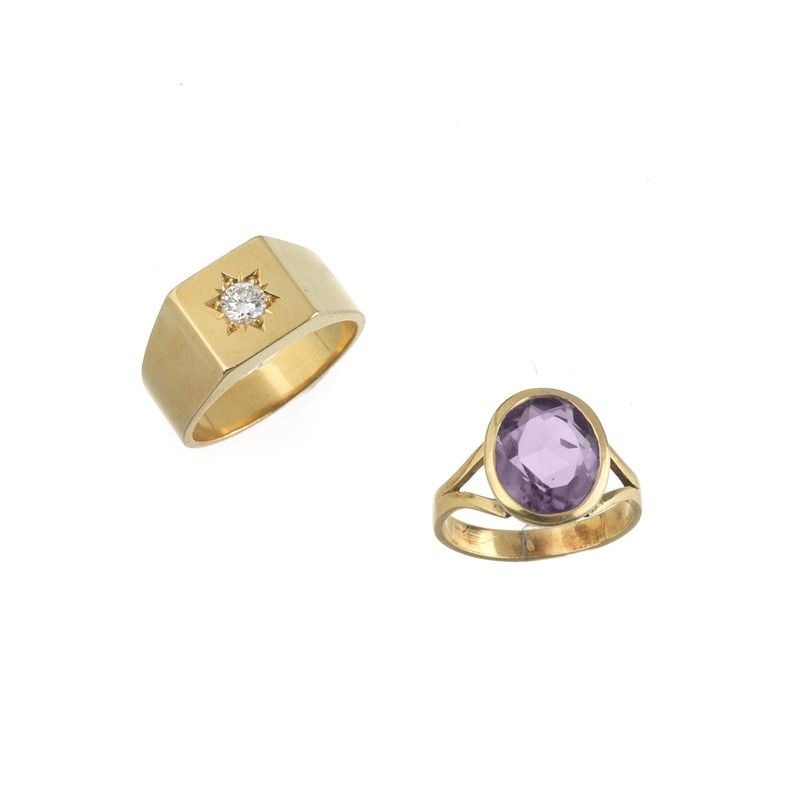 in oro giallo 18kt, di cui uno impreziosito da un'ametista taglio ovale di ct 2.40 circa, mis. 15/55, accompagnato da un secondo anello modello chevalier con diamante taglio brillante di ct 0.25 circa, mis. 17/57, gr. 18 complessivi