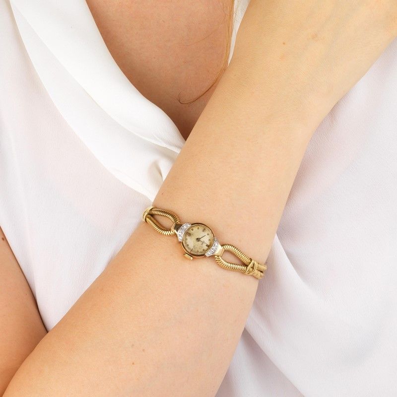 EBEL OROLOGIO DA DONNA CON BRACCIALE IN ORO cassa in oro giallo 18kt, fondello a pressione, anse impreziosite da piccoli brillanti, quadrante argenté con indici applicati, bracciale a cordicella a due fili in oro giallo 18kt con chiusura a scomparsa in oro giallo, gr. 36. Diam. mm 16. Orologio non funzionante.
