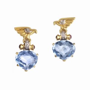 PAIO DI ORECCHINI PENDENTI CON PIETRE SINTETICHE E DIAMANTI in oro giallo e bianco 18kt, realizzati a forma di [..]