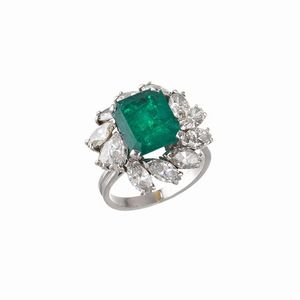 ANELLO CON SMERALDO E DIAMANTI in oro bianco 18kt, con al centro uno smeraldo taglio ottagonale di ct 3.70 circa, [..]