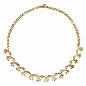 COLLANA A CATENA in oro giallo 18kt, composta da una serie di maglie rettangolari alternate ad elementi a forma [..]