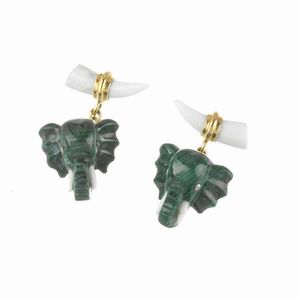 PAIO DI GEMELLI A FORMA DI ELEFANTI in oro giallo 18kt, con teste di elefanti in malachite, dim. cm 1,5x3 circa, [..]