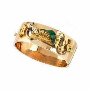 BRACCIALE RIGIDO in oro a basso titolo, recante sulla sommità un motivo a rilievo decorato in smalto verde [..]