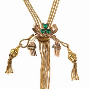 DEMI PARURE CON GRANATI in oro giallo 18kt, composta da lunga collana da cui pende un ciondolo a forma di croce, [..]