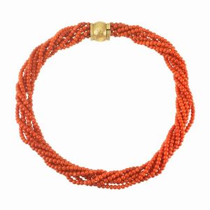 COLLANA TORCHON IN CORALLO composta da sette fili di sfere in corallo di mm 4 circa, fermatura in oro giallo 18kt, [..]