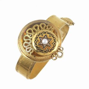 BRACCIALE A FASCIA in oro a basso titolo, realizzato a forma di cintura, con grande fibbia circolare raffigurante [..]