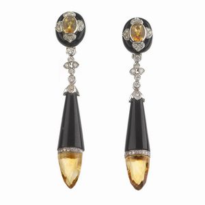 PAIO DI LUNGHI ORECCHINI PENDENTI in oro bianco 18kt, composti da parti in onice e pietre semipreziose sfaccettate, [..]