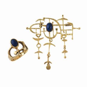 SPILLA E ANELLO GEOMETRICI in oro giallo 18kt, entrambi realizzati seguendo un motivo geometrico, spilla impreziosita [..]