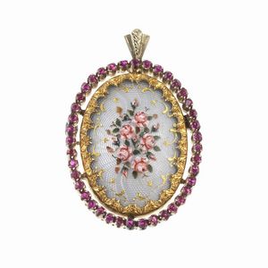 SPILLA/PENDENTE CON MOTIVO FLOREALE in oro e argento, di forma ovale, con parte centrale entro cornice decorata [..]