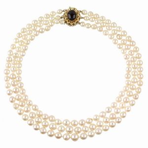 COLLANA DI PERLE composta da tre fili di perle leggermente digradanti di mm 9-6 circa, fermatura in oro 18kt, [..]