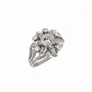 ANELLO FLOREALE CON DIAMANTI in oro bianco 18kt, impreziosito al centro da un diamante taglio brillante di ct [..]