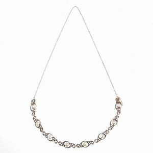 COLLANA CON PERLE E DIAMANTI in oro e argento, impreziosita da perle di mm 5 circa e rose di diamante, catena [..]