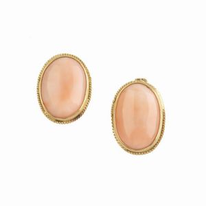 PAIO DI ORECCHINI CON CORALLO ROSA in oro giallo 18kt, recanti due coralli rosa taglio cabochon, chiusura a clip, [..]