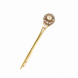 SPILLO CON PERLE E DIAMANTI in oro a basso titolo, impreziosito all'estremità da un fiore composto da due [..]