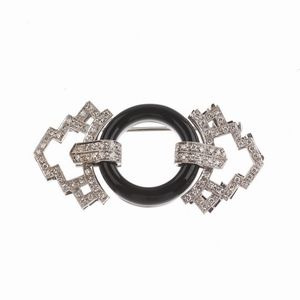 SPILLA CON ONICE E DIAMANTI in oro bianco 18kt, con al centro un disco in onice affiancato da parti impreziosite [..]