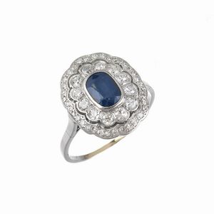 ANELLO FLOREALE CON ZAFFIRO E DIAMANTI in platino, impreziosito al centro da uno zaffiro taglio ovale di ct 1 [..]
