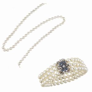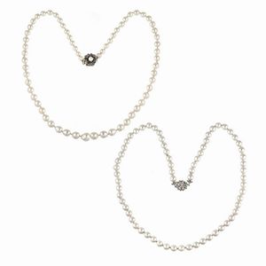DUE LUNGHE COLLANE DI PERLE di cui una ad un filo di perle digradanti di mm 9-5 circa, fermatura a forma di fiore [..]